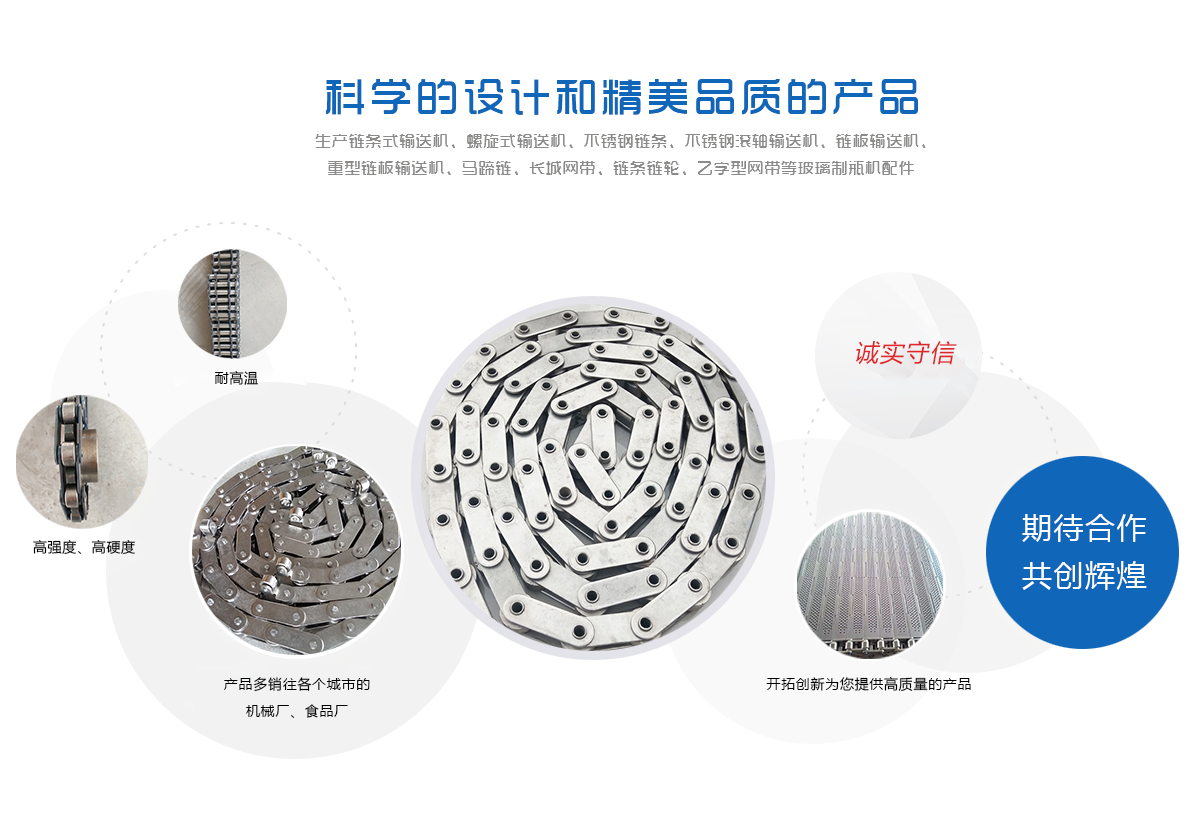 生產(chǎn)鏈條式輸送機、螺旋式輸送機、不銹鋼鏈條、不銹鋼滾軸輸送機、鏈板輸送機、重型鏈板輸送機、馬蹄鏈、長城網(wǎng)帶、鏈條鏈輪、乙字型網(wǎng)帶等玻璃制瓶機配件,食品機械配件及各種網(wǎng)帶的專業(yè)廠家 ,多年來產(chǎn)品暢銷各地玻璃廠和食品廠,在玻璃制品等行業(yè)中享有較高的聲譽。公司集摸具開發(fā)、機械設(shè)計生產(chǎn),銷售于一體的生產(chǎn)型企業(yè)。生產(chǎn)的自動化流水線金屬傳動網(wǎng)帶、鏈條等產(chǎn)品廣泛用于玻璃機械、食品機械、化纖機械、醫(yī)藥、電子、烘干機械、輪胎機械等行業(yè)。產(chǎn)品多銷往各個城市的機械廠、食品廠和一些涉及流水線或自動化設(shè)備的公司。